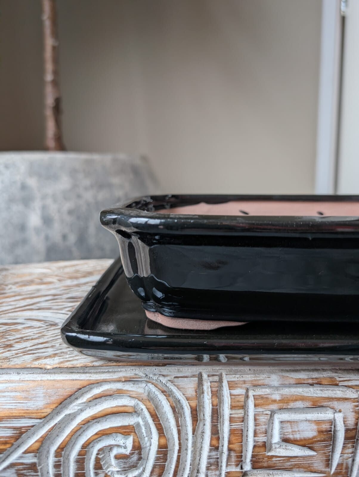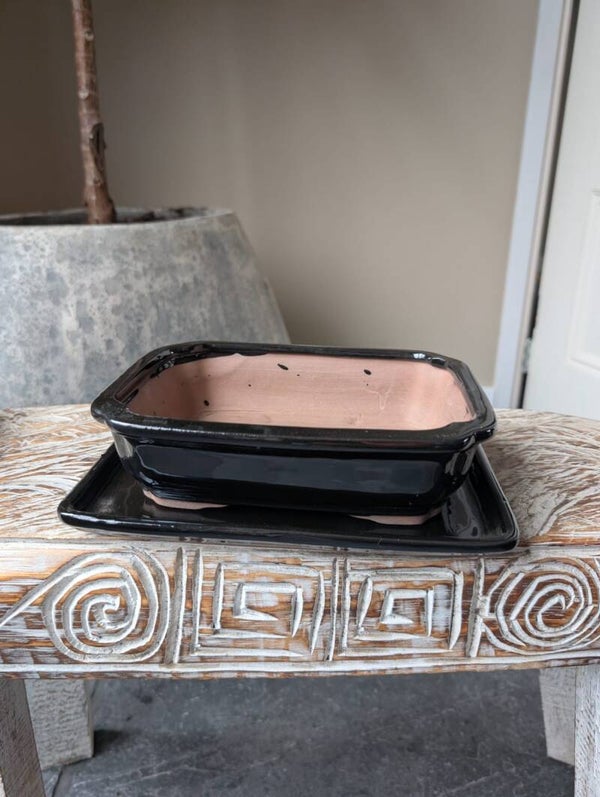 Bonsai pot 21.2 x 16 x 5.7 met schotel zwart Geglazuurd